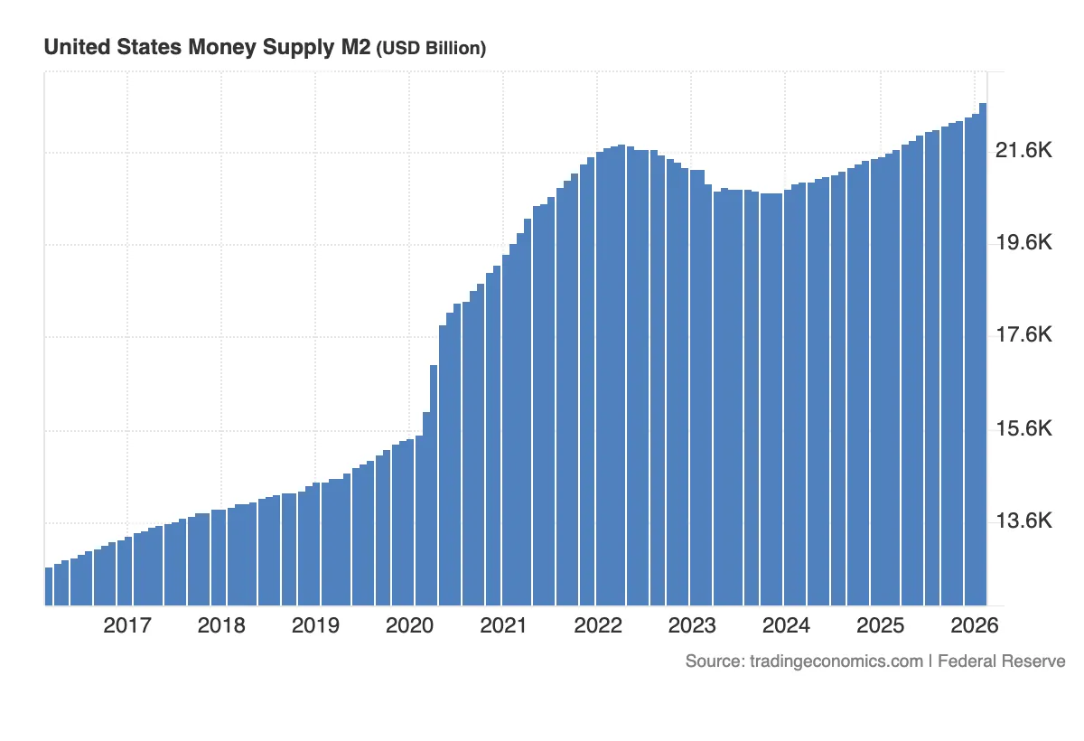 Има различни мерки за измерване на общото количество пари в обращение в една икономика, като най-често ползваната се нарича M2 - тя включва банкноти, монети, краткосрочни депозити и разплащателни сметки. Ако проследим движението на M2 на водещите валути в света, американският долар и еврото, ще видим с каква рекордна скорост се “печатат” нови пари. Този процес се засилва особено през януари 2020-та година, като за последните 6 години са напечатани близо 29% от всички американски долари.